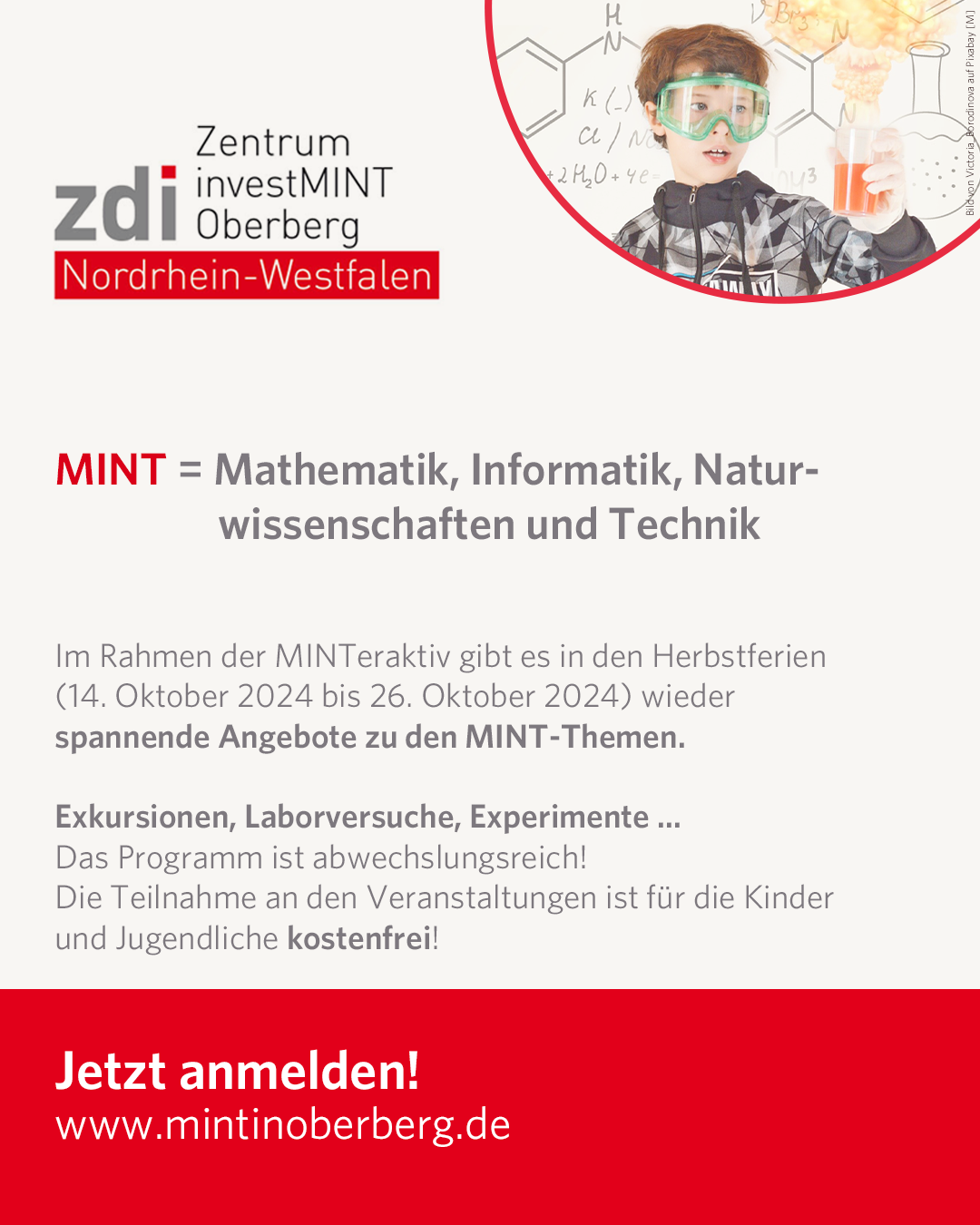 Oberbergischer Kreis. Auch in den Herbstferien 2025 heißt es wieder: Forschen, tüfteln und entdecken! Vom 13.10. – 24.10.2025 lädt das zdi‑Zentrum investMINT Oberberg zur 15. Auflage der Herbstakademie MINTeraktiv ein.
