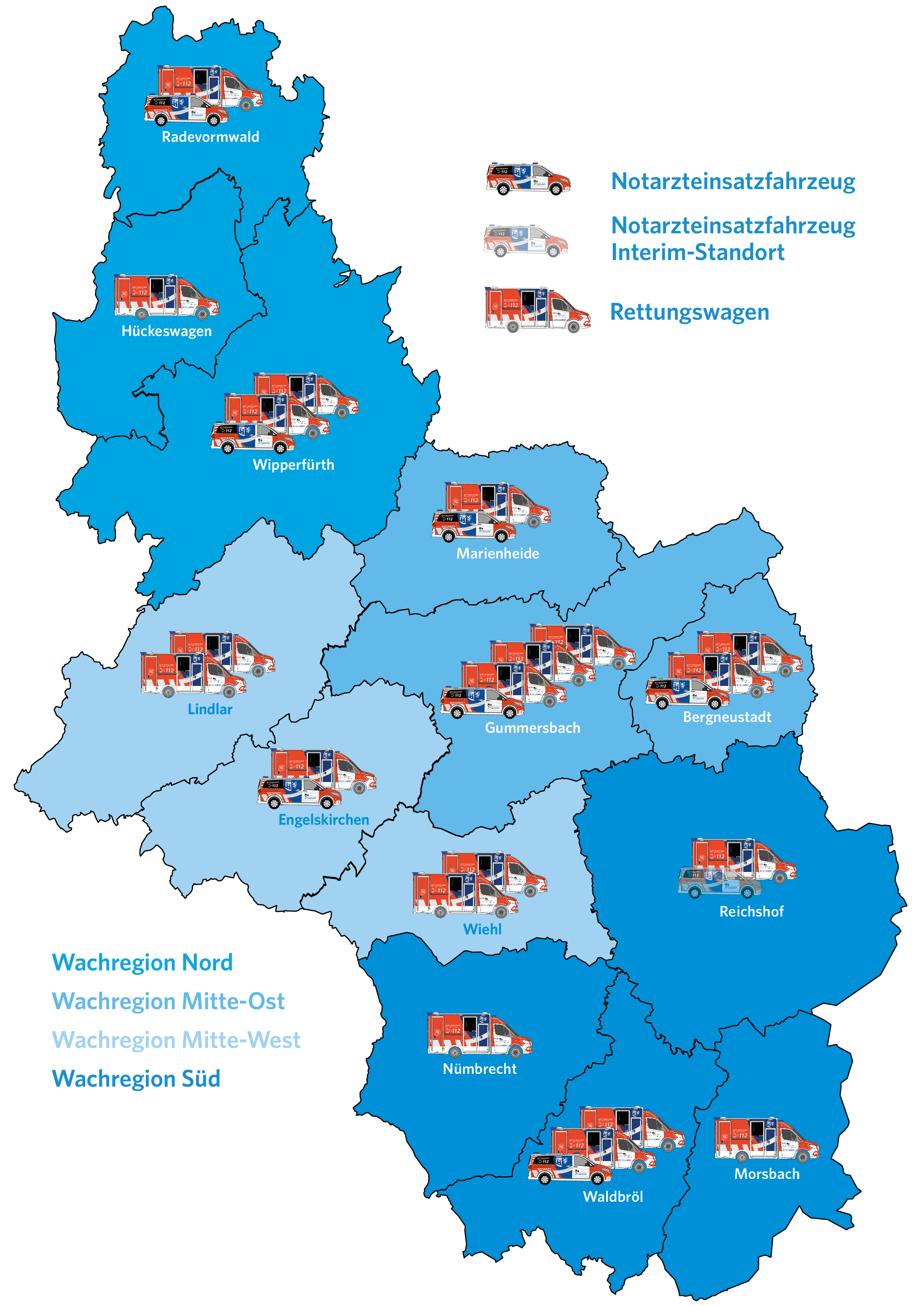 Der oberbergische Rettungsdienst ist in vier Regionen aufgeteilt, welche wiederum jeweils mehrere Wachen einschließen. Somit wird eine lokale Struktur sichergestellt, die den Mitarbeiterinnen und Mitarbeitern eine Heimat und der Bevölkerung regionale Versorgungsleistungen bietet. Insgesamt wird so das gesamte Kreisgebiet abgedeckt und im Rahmen der überörtlichen Hilfe auch in die Nachbarstädte des Rhein-Sieg-Kreises, des Rheinisch-Bergischen Kreises und des Märkischen Kreises ausgerückt. Durch einen Klick auf die jeweilige Region erhalten Sie weitere Informationen zu den Standorten.